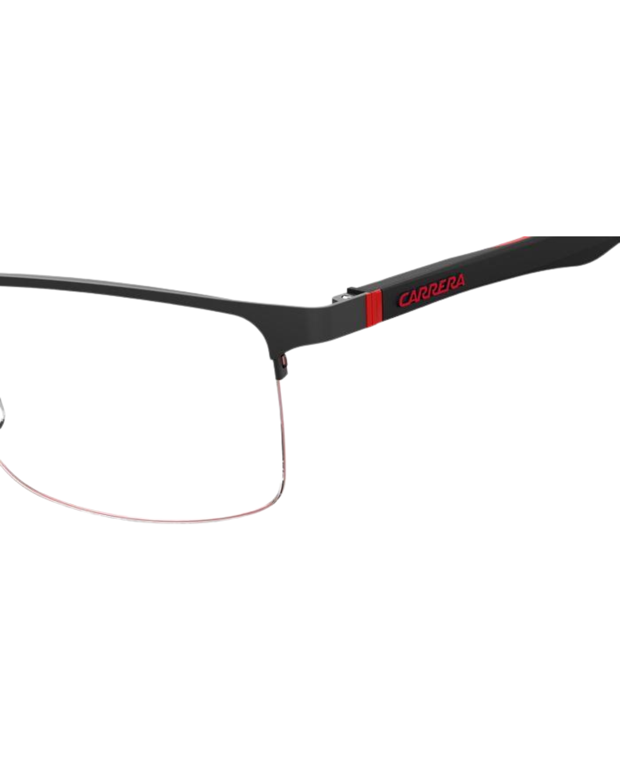 The Carrera 8843 807 is a high-performance, semi-rimless optical frame that shares the same architectural design as the 003 model but differs primarily in its finish. While the 003 is matte black, the 807 features a classic Polished (Shiny) Black finish.